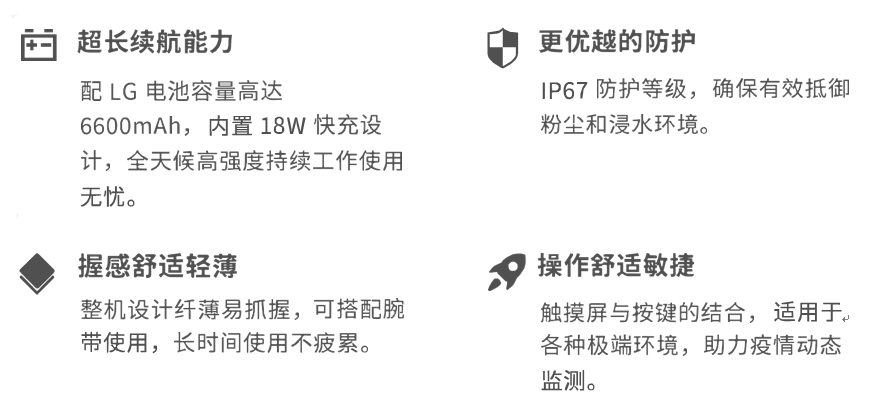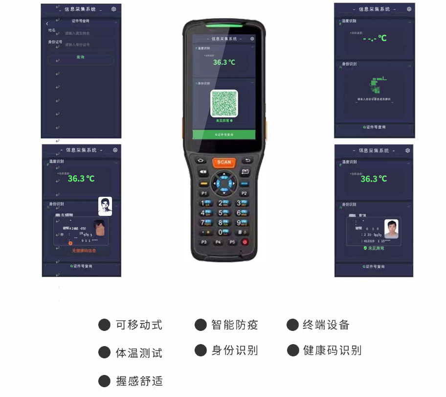 本產品是一款移動式智能防疫終端設備,主要有身份識別,健康碼識別以及人體測溫等功能,另外產品握感舒適,性能強勁,動力持久,可以更快更好的幫助防控人員提升工作效率,減少接觸感染。產品可廣泛用于地鐵、車站、小區、場館等地人員測溫于檢查。